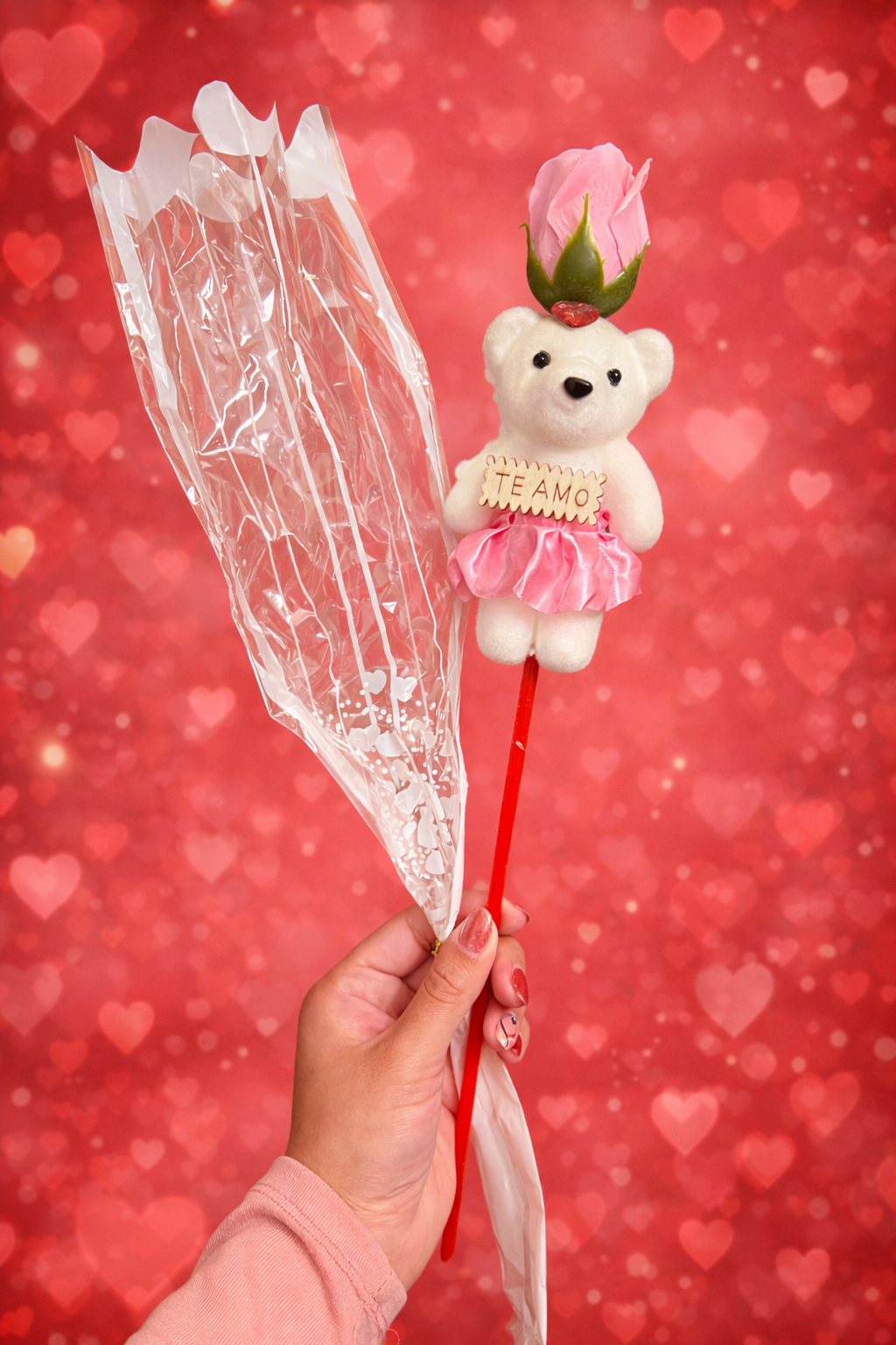 A pink "rose" with a white bear. Bear has a sign that reads "I Love You" or "Te Amo". Each "rose" measures at least 16 inches in length.